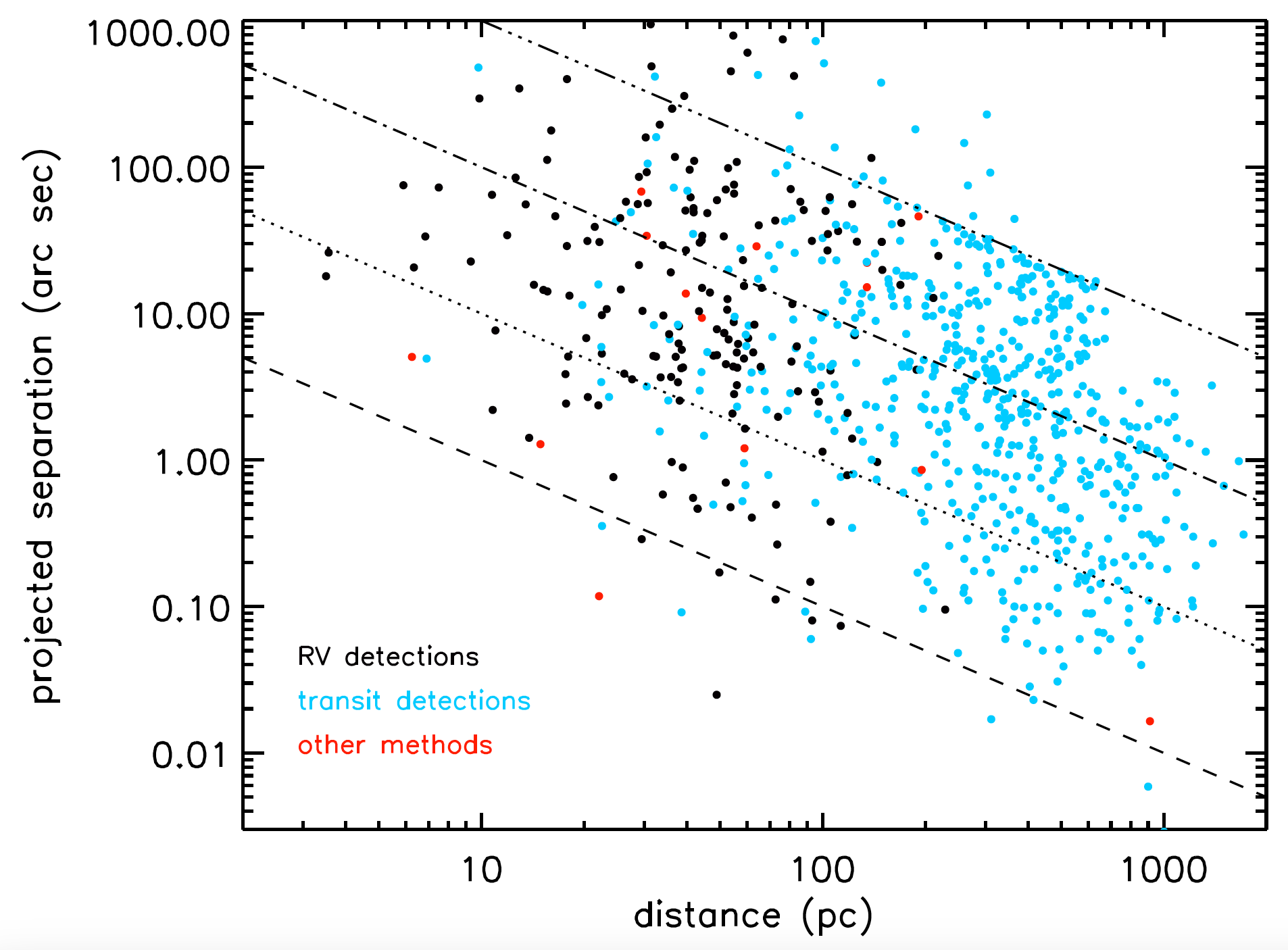 There is, however, an illutrative way to show that the depletion of planet-hosting tight binaries is not only due to observational biases, which is to plot the distribution of projected angular separations as a function of distance to the system (see Figure 2 below, where the 4 lines correspond to physical separations of 10au, 100au, 1000au and 10000au). As can be seen, there is a population of r<10-20au planet-bearing binaries at d≤100pc with an angular separation >0.1" that should have been detectable by current instruments (because such planet-bearing binaries with separations down to 0.1" have been observed in the d≥100pc domain) but which were not detected. The (at least qualitative) conclusion is that there is a real physical depletion of <20au binaries with planets (note: in order not to squeeze the graph's Y-axis, proxima Cen does not appear)