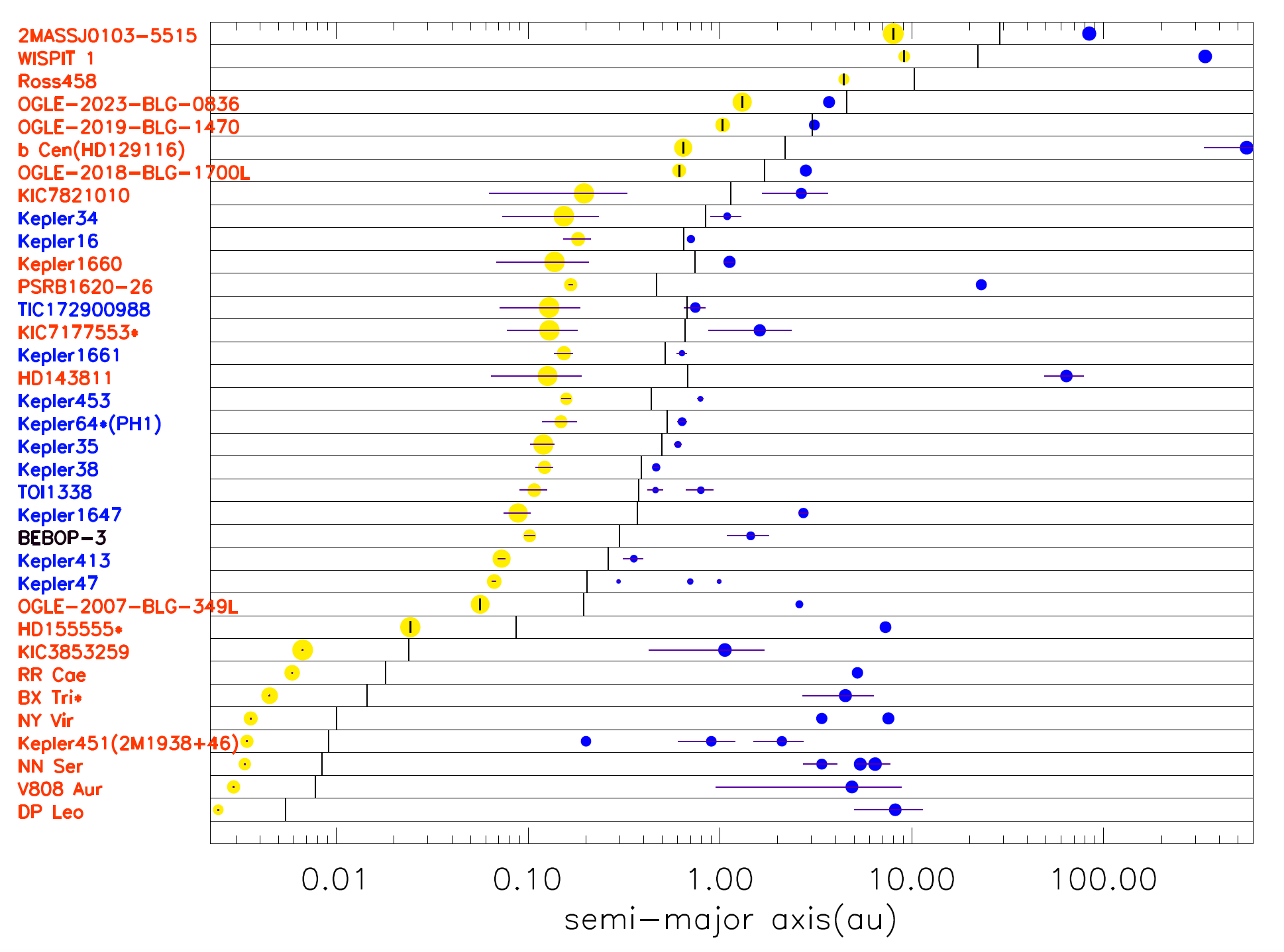 Figure 1: Architecture of confirmed binary systems harboring a confirmed exoplanet on a P-type orbit, that is, a planet orbiting both stars. Note that we plot here, for both the companion star and the planet(s), the semi-major axis centered on the binary's center of mass. The blue circles' location shows the semi-major axis of the exoplanet while the yellow circles show the location of the companion star. The radius of the blue circle is proportional to the estimated radius of the planet (or the cubic root of its mass when only a mass estimate is available). The radius of the yellow circle is proportional to the cubic root of the mass ratio between the companion and the central star (for the sake of visibility, the sizes of the planets have been inflated by a factor 20 with respect to the sizes of the yellow stars).